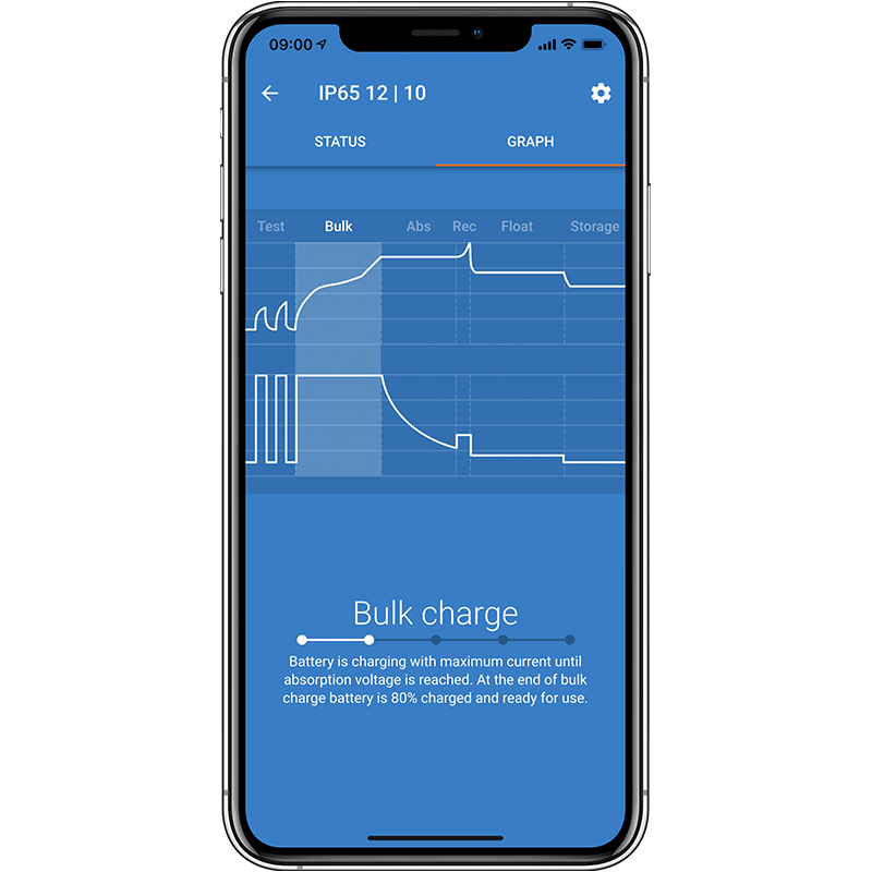 El Blue Smart IP65 está equipado con Bluetooth integrado, por lo que el estado del cargador y la batería se puede comprobar en un smartphone, tablet u ordenador portátil. Todos los ajustes del cargador se pueden configurar con la app VictronConnect.