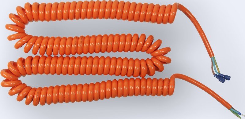 Cable en espiral de aprox. 1,2 m de longitud, prolongable hasta aprox. 5 m, cable resistente al aceite y a los ácidos, apto para grandes esfuerzos mecánicos y uso en locales húmedos. Versión de 3 hilos 2+PE, sin enchufe de carga. Capacidad de carga: