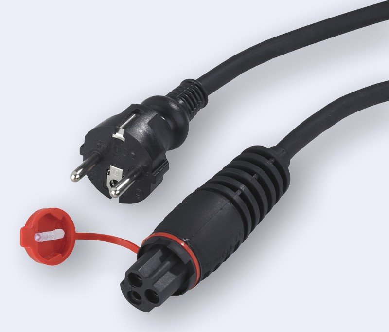 Cable robusto de goma de 5 m de longitud, negro, para grandes esfuerzos mecánicos, con acoplamiento de enchufe moldeado (Calix) y enchufe de red, 230V AC / 16A, 2pin + E, apto para 2303.