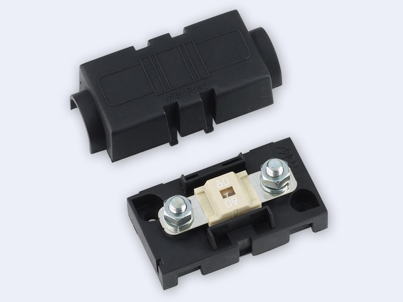 Portafusibles totalmente aislado para la protección de fusibles de alta carga para grandes consumidores o circuitos de alta carga. El portafusibles se puede ensamblar y está equipado con pernos roscados M5 en ambos lados. Se suministra sin fusible roscado de automoción (véase fig. 15). Dimensiones: 61 x 30 x 25 mm