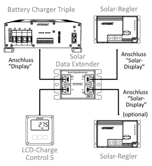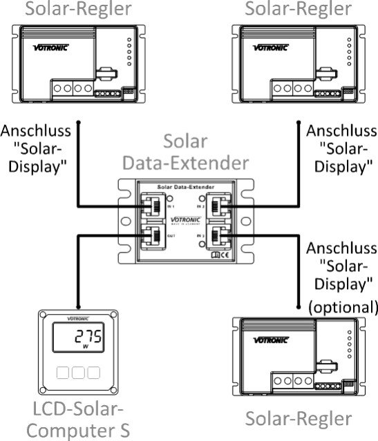 El Solar Data Extender combina los datos de hasta tres reguladores solares para poder mostrarlos en una sola pantalla. La conocida pantalla LCD puede seguir utilizándose. Es compatible con los siguientes dispositivos